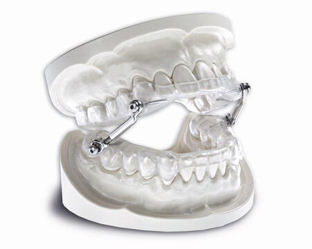 Das Gerät besteht aus jeweils einer transparenten starren Kunststoffschiene für den Ober- und Unterkiefer. Beide Schienen sind durch Metallstäbe miteinander verbunden. Der Unterkiefer hat etwas seitliche Bewegungsfreiheit, ist aber nicht in der Lage nach hinten zu fallen.